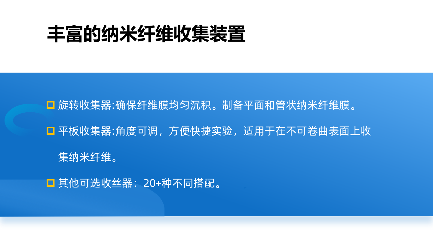 在靜電紡絲中,平行電極收絲器是實驗室用來收集定向纖維膜的主要裝置之一,平行電極收絲器收集到的纖維定向程度高。通力微納提供多種不同設計的平行電極收絲器。