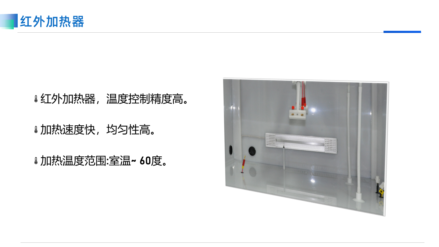 置于機箱上部,通過采用高透光率玻璃與機箱隔離的可見光加熱,靜態加熱系統,無氣流干擾,無電場干擾。推薦生物醫藥領域應用。
